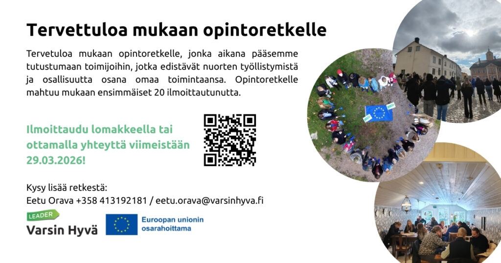 Tervetuloa mukaan opintoretkelle, jonka aikana pääsemme tutustumaan toimijoihin, jotka edistävät nuorten työllistymistä ja osallisuutta osana omaa toimintaansa. Opintoretkelle mahtuu mukaan ensimmäiset 20 ilmoittautunutta. https://forms.cloud.microsoft/e/1tKwg9rX1t Vierailemme erilaisissa kohteissa, kuten: Nautelankosken museo: https://www.liedonmuseo.fi/nautelankosken-museo Mannin Navetalla: https://manninnavetta.fi/ Retki on osallistujille ilmainen sisältäen aamu- ja iltapäiväkahvit sekä lounaan. Sitovat ilmoittautumiset 29.03.2026 mennessä. Lähtö opintoretkelle tapahtuu Ravattulan K-Citymarketin parkkipaikalta ja […]
