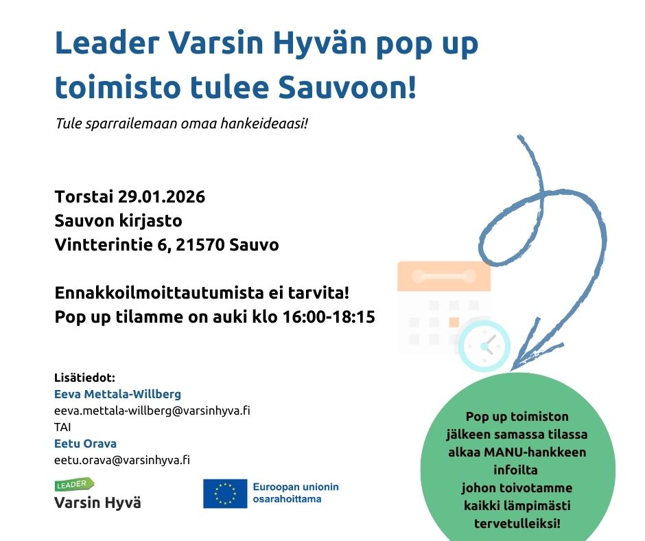 Leader Varsin Hyvän pop up-toimisto Sauvon kirjastolla torstaina 29.1. klo 16-18.15