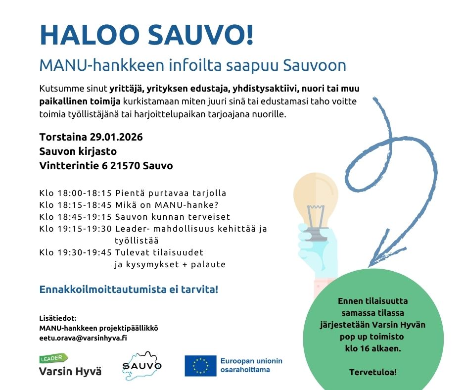 Toivotamme kaikki Sauvossa ja lähialueella toimivat yhdistykset, yksin- ja pienyrittäjät sekä muut aiheesta kiinnostuneet tervetulleiksi pohtimaan, voisiko juuri teidän toiminnassanne jatkossa olla mukana nuoria työntekijöinä ja toiminnan kehittäjinä. Infoillan tarkoitus on tarjota tietoa millaista apua toiminnan suunnitteluun ja kehittämiseen on tarjolla sekä kartoittaa toimijoiden tarpeita tulevia tilaisuuksia varten.